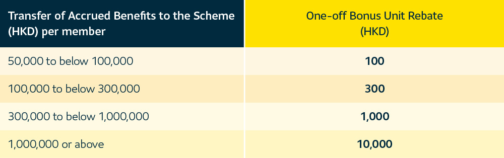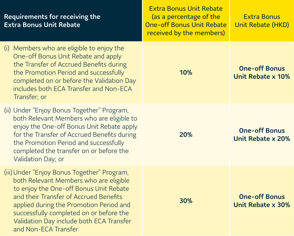 “One-off Bonus Unit Rebate” refers to the amount of one-off bonus unit rebate (listed below in Table 1 - Details of One-off Bonus Unit Rebate) which will be received by members who meet the requirements mentioned in the terms and conditions of the “Enjoy Bonus Together” Program.
