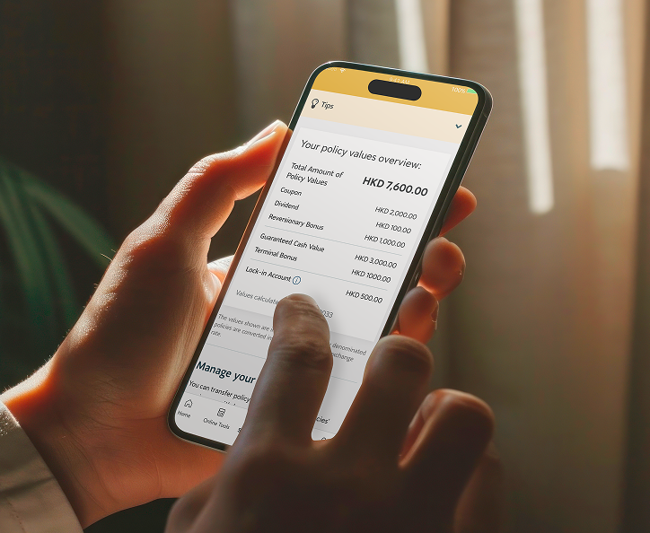 透過保單價值詳情頁面隨時查閱紅利、現金/可支取現金等各項保單價值金額;想提取保單價值同樣輕鬆,即使身在海外都可使用海外銀行戶口收取款項!