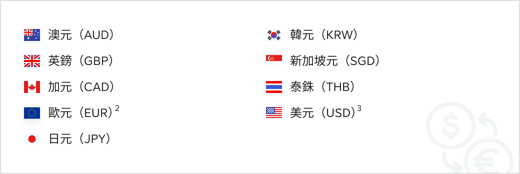 您現在可以使用您的海外銀行戶口收款¹ ,即使身在外地,提取保單價值同樣輕易!您可以透過以下貨幣收款: