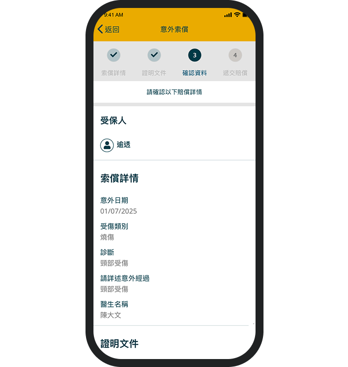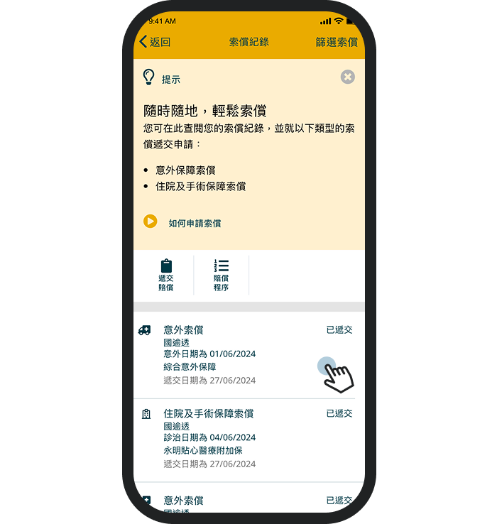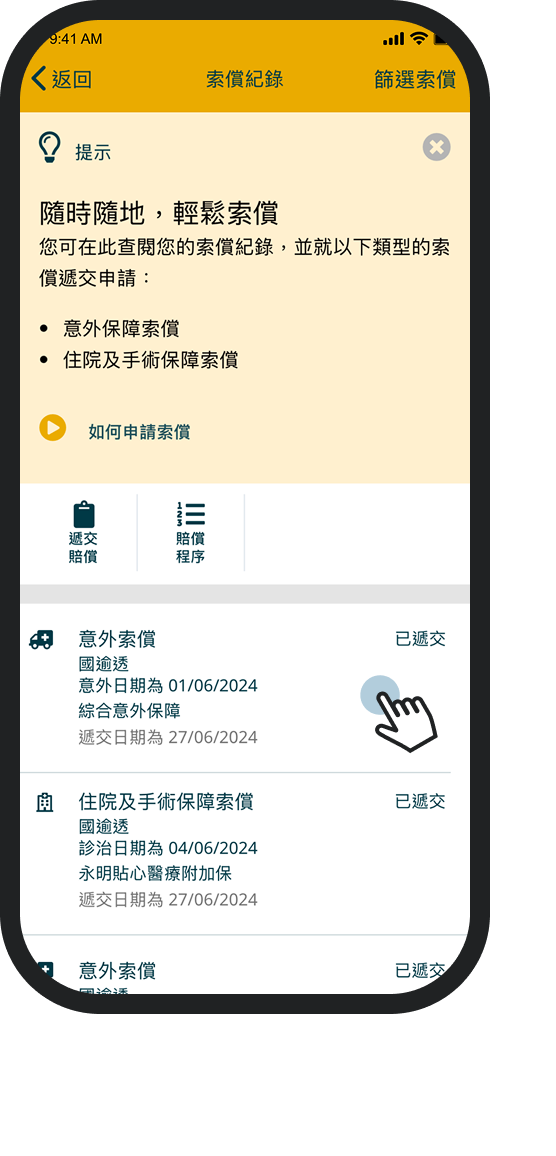 錯過了推送通知?您可以隨時登入App並按以下步驟查詢索償狀態:
