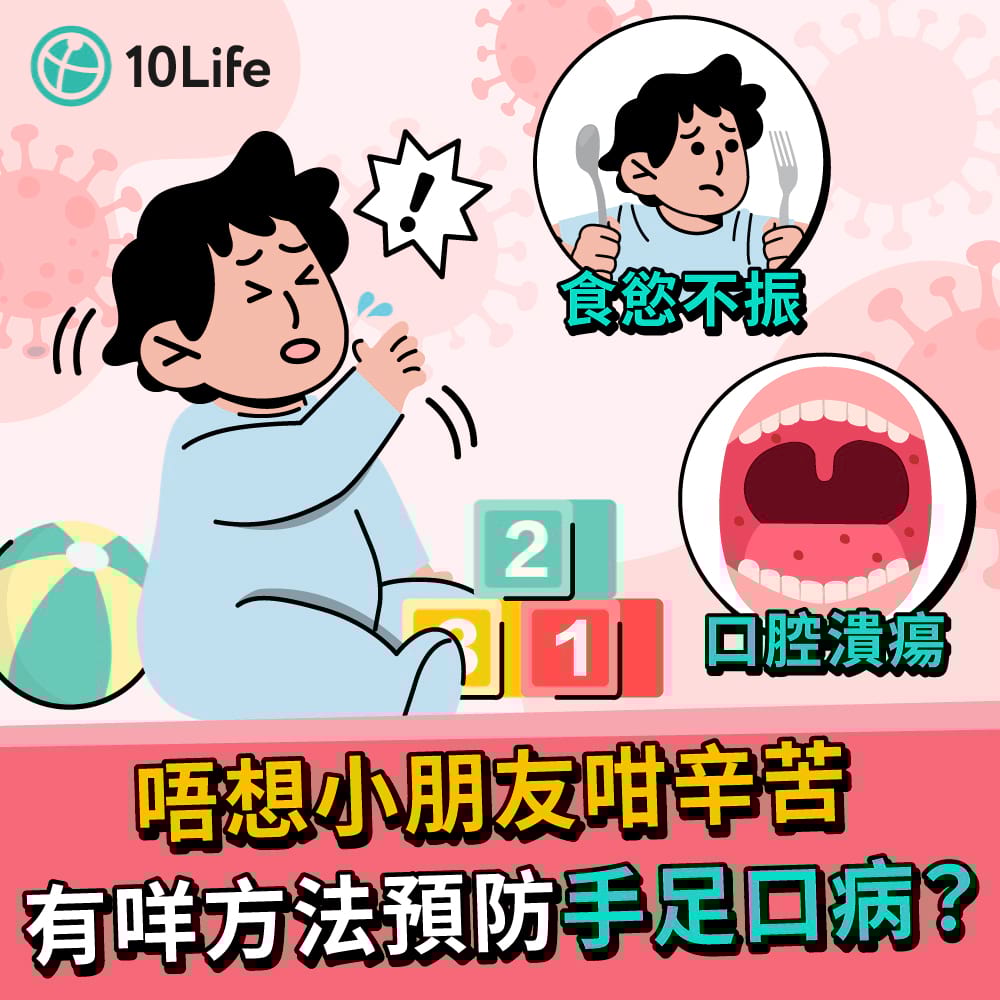 根據衞生署資料,手足口病可以由多種腸病毒引起,例如柯薩奇病毒和EV71型腸病毒,主要感染5歲以下的幼童,病徵多為連續發燒數天,手腳出現水泡或紅疹,口腔內和舌頭旁邊亦會有引起疼痛的潰瘍,因而影響食慾。