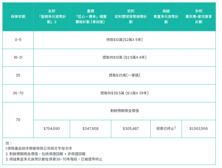 表:5款儲蓄保險生效70年後的預期現金價值比較 (美元)