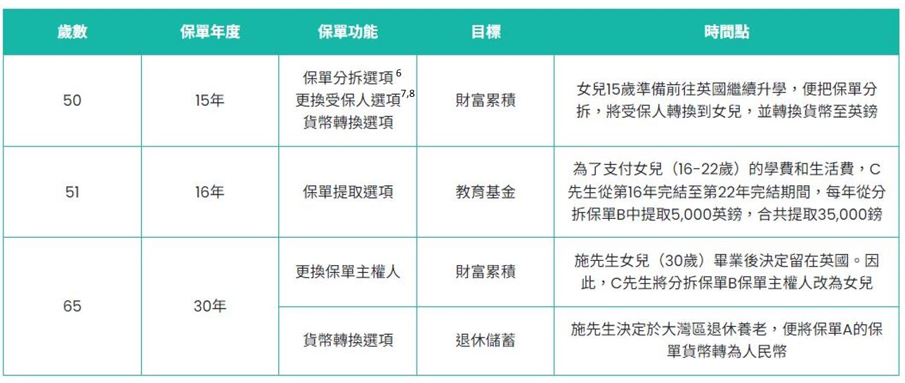 施先生(化名)35歲時投保了永越多元貨幣計劃(12年繳),每年保費5,000美元,以實現不同人生階段目標,包括為初生女兒(0歲)設立教育基金,準備自己的退休儲蓄,以至日後傳承財富。