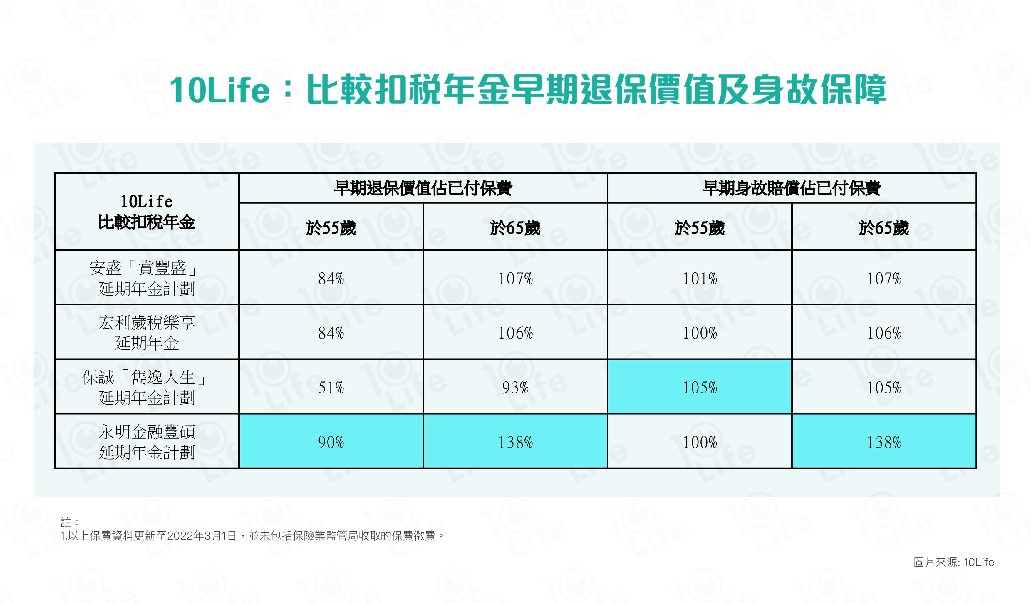 - 本文由10Life從不同途徑搜集市場資料製作而成,僅供一般參考之用,並沒有考慮任何個人需要及合適性,亦不應被視爲銷售建議。投保前應與持牌保險顧問商討適合自己的保險方案,並以保險公司提供的資料爲準。