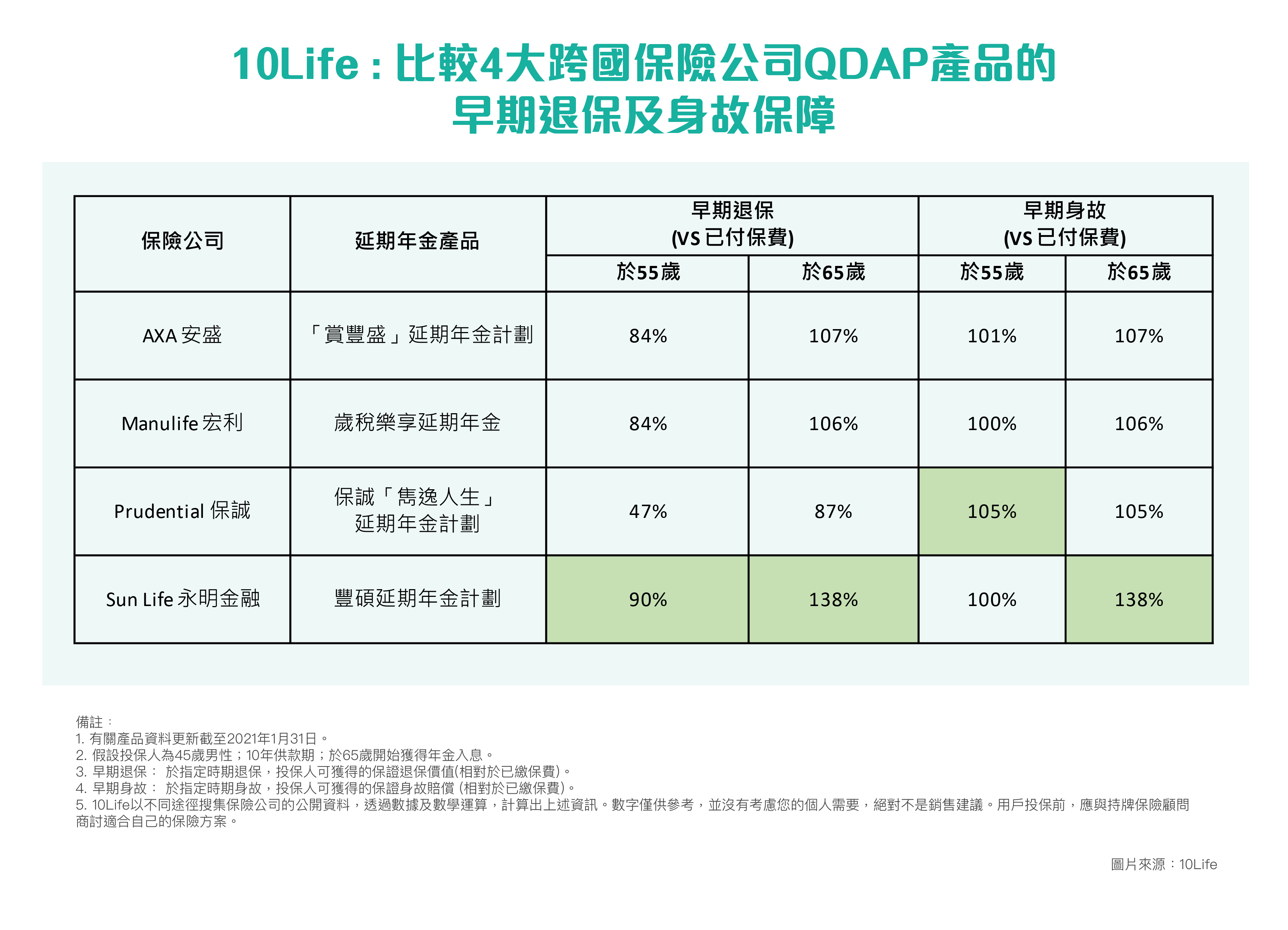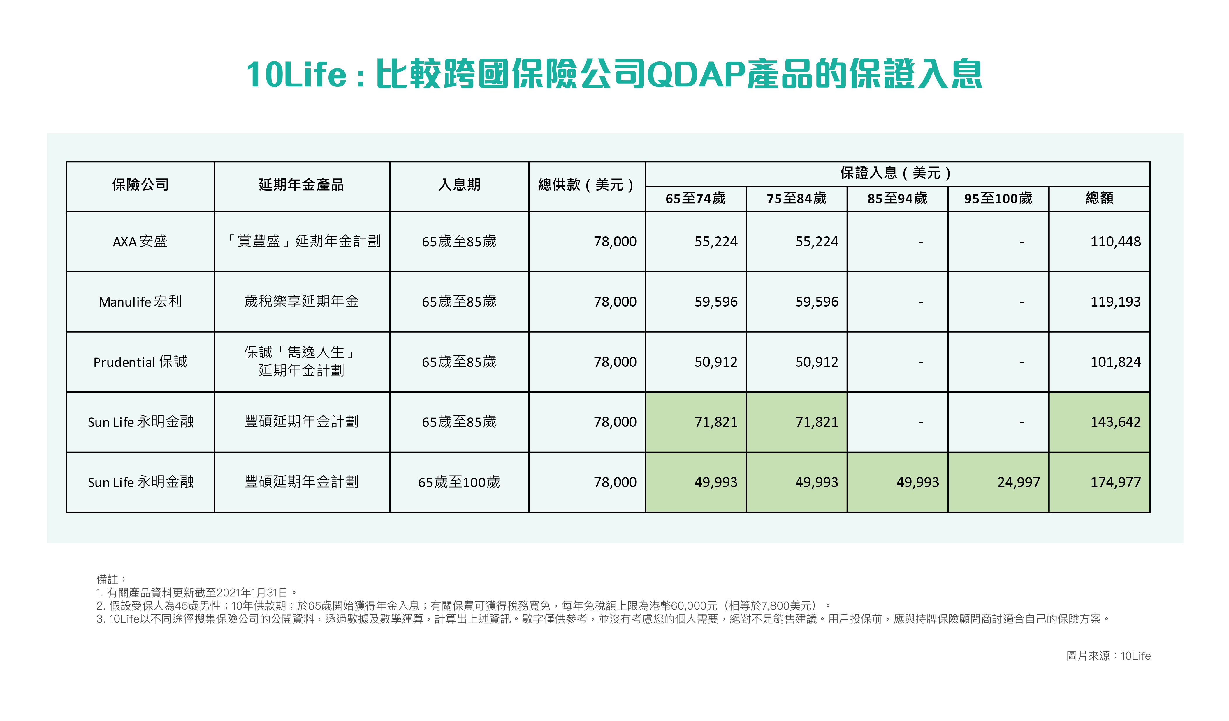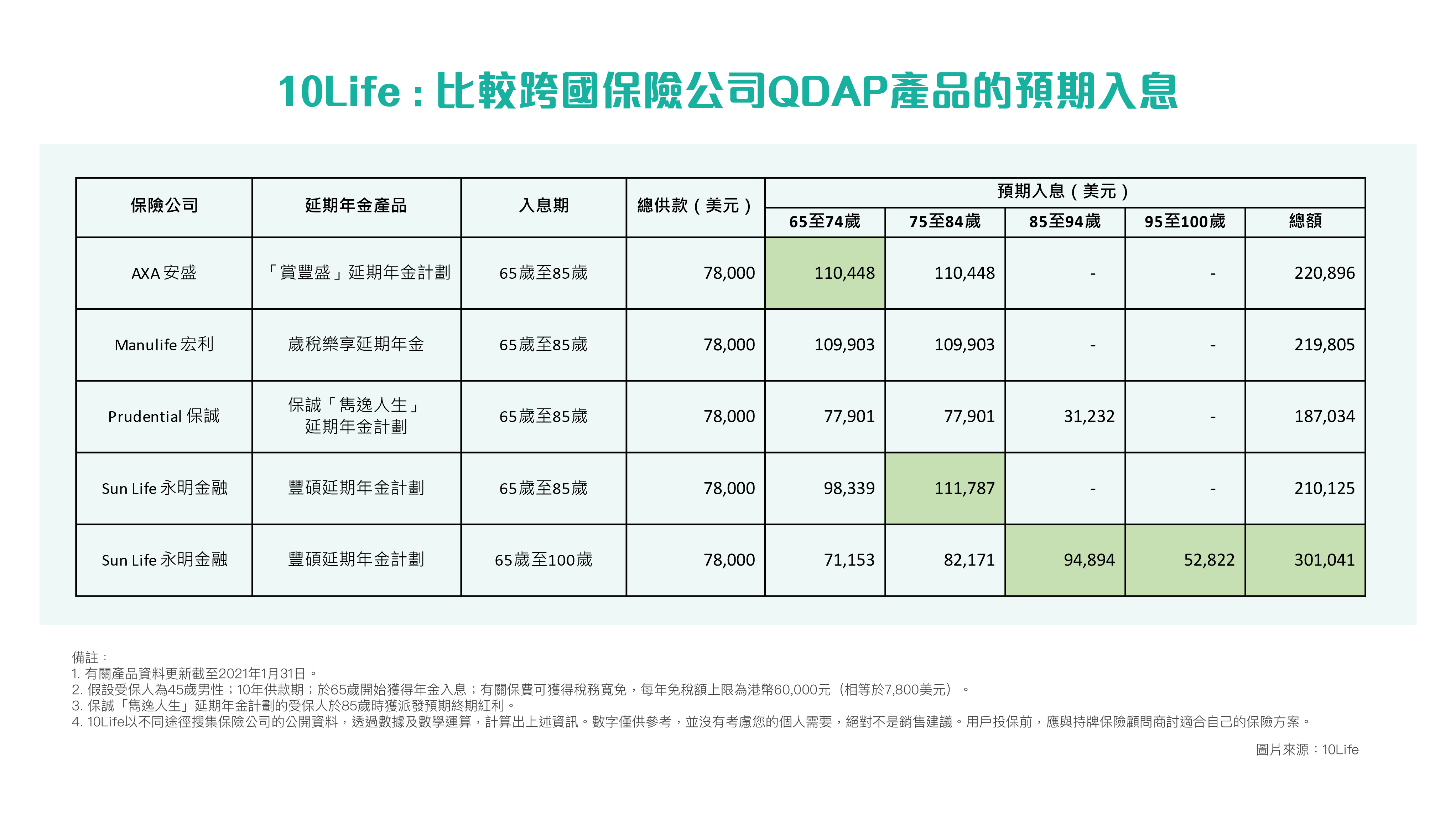 根據政府統計處《香港人口推算2020–2069》*,長者人口將由2019年的132萬增至2039年的252萬,屆時有三分一人口是長者。人口老化令人意識到退休規劃的重要,而扣稅優惠更帶動QDAP的需求,尤其吸引高薪一族。基於退休規劃為考慮,10Life以相近的情況來比較產品,假設投保人為45歲男性,供款10年,並於一般退休年齡65歲(或最接近年期)開始獲得年金入息。